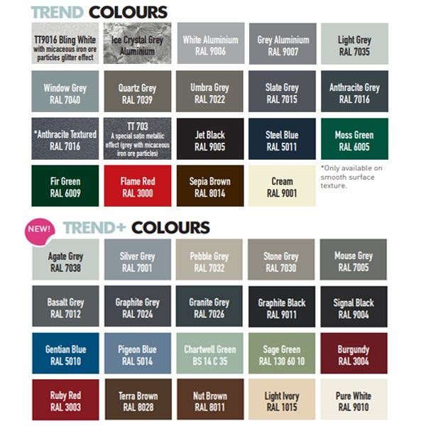 - Available in hundreds of combinations, including Trend colours, special RAL shades, and realistic wood effects like Golden Oak and Rosewood.