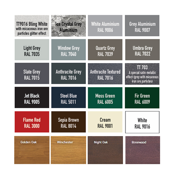 You can choose from 24 standard finished colours for the door panels, alongside the option to have ANY specific RAL colour mixed at an extra cost.