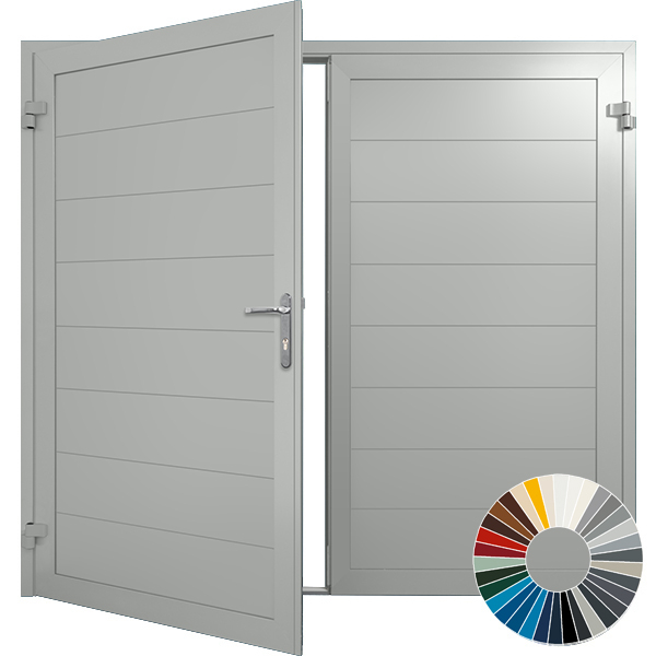 These doors come with a block frame. The profiles are aluminium infilled with steel double-skinned, PU-foamed panels. To be fitted inbetween the opening, opening outwards.